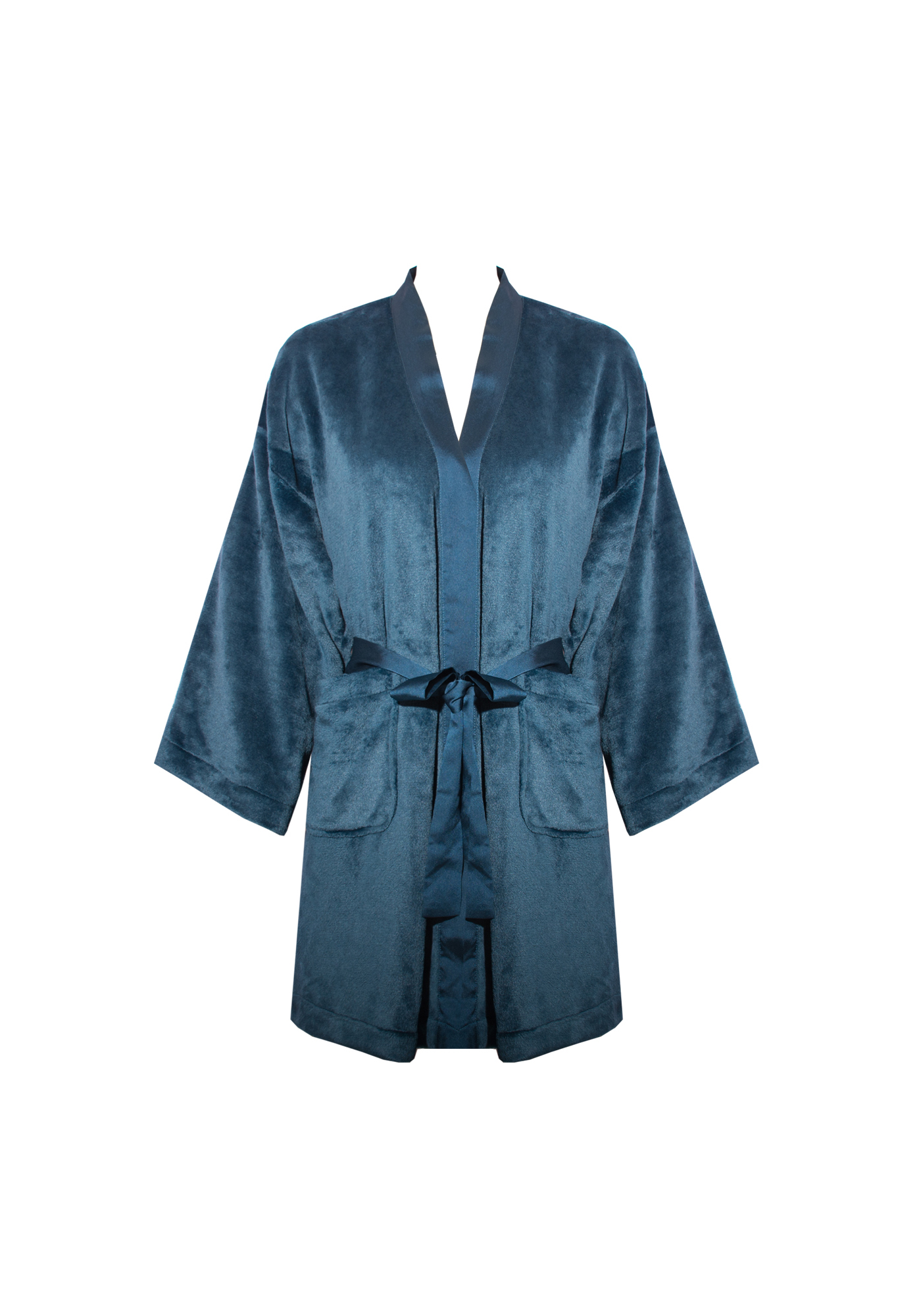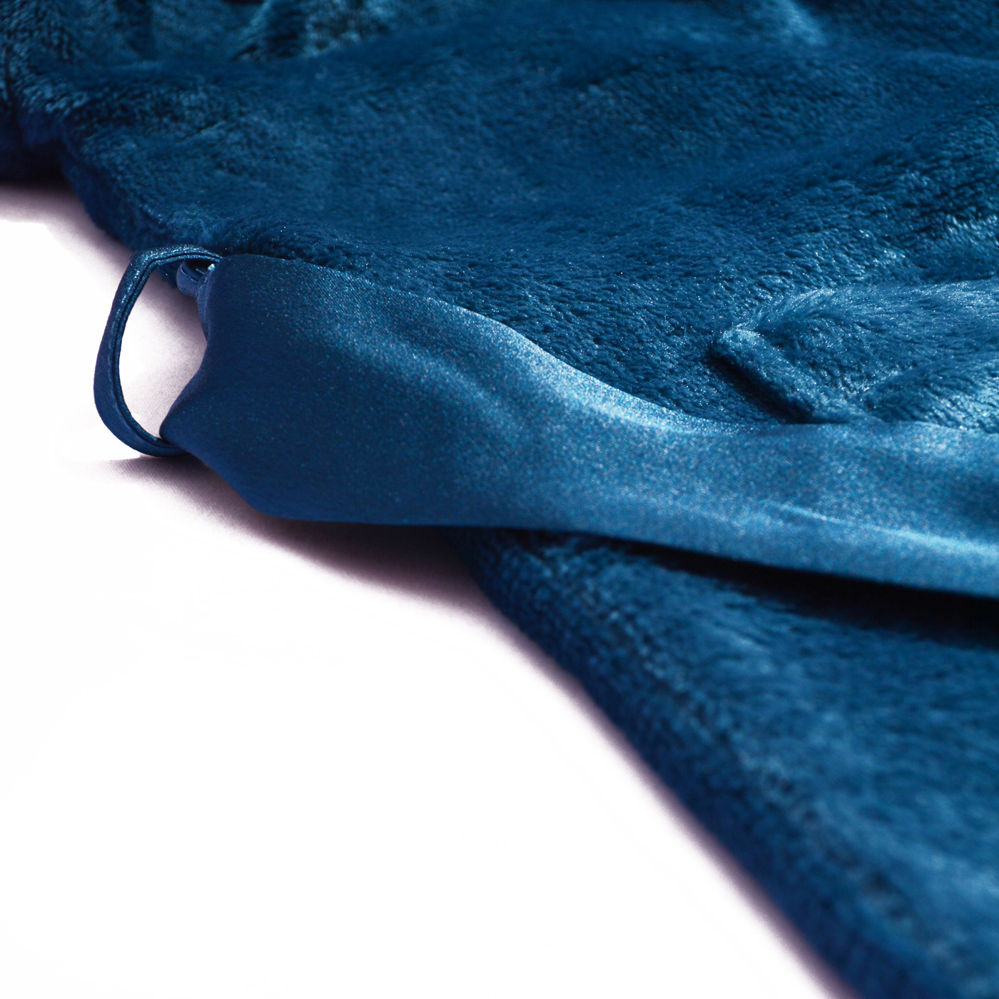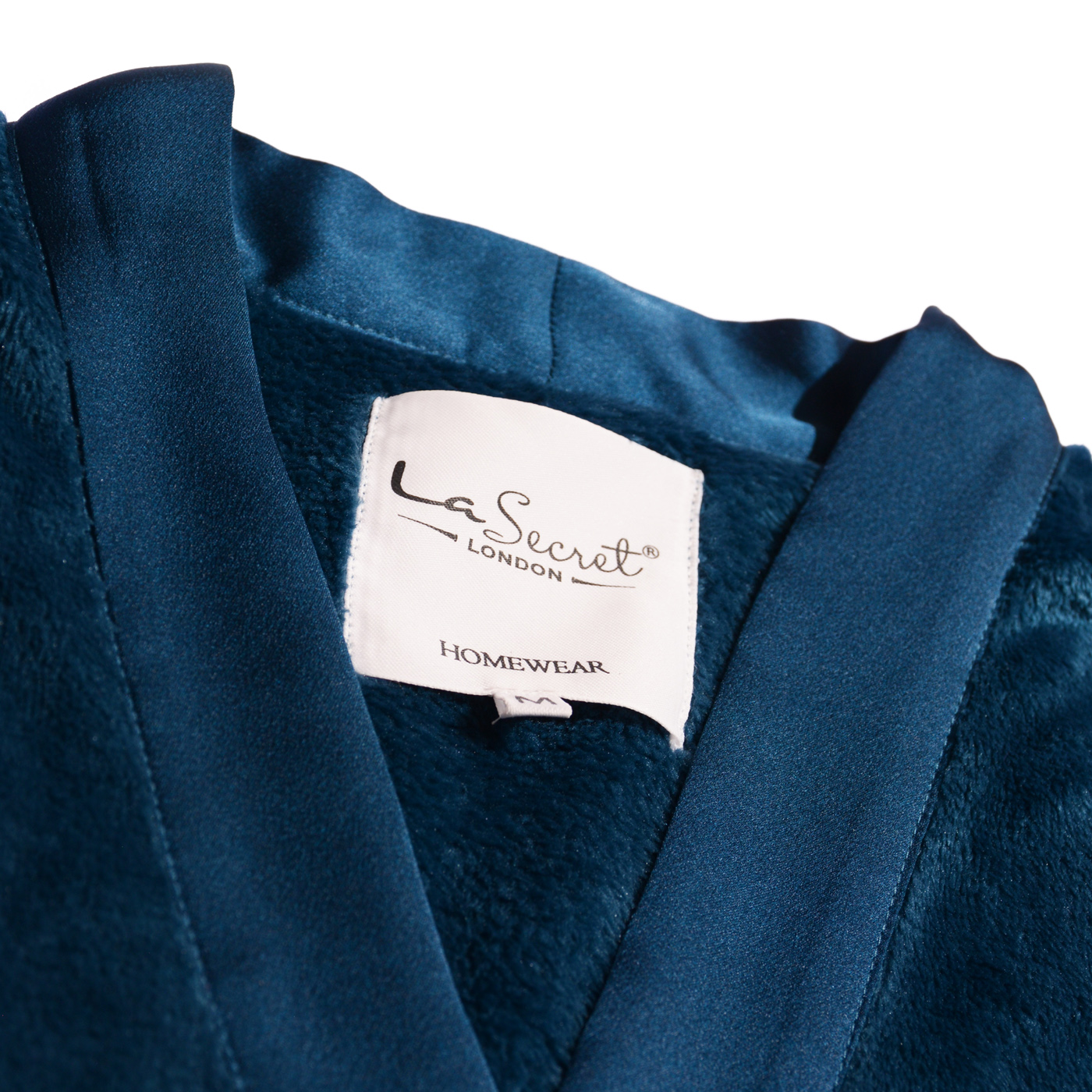 Very soft cozy fleece rob with satin shawl collar , featuring a satin tie waist.