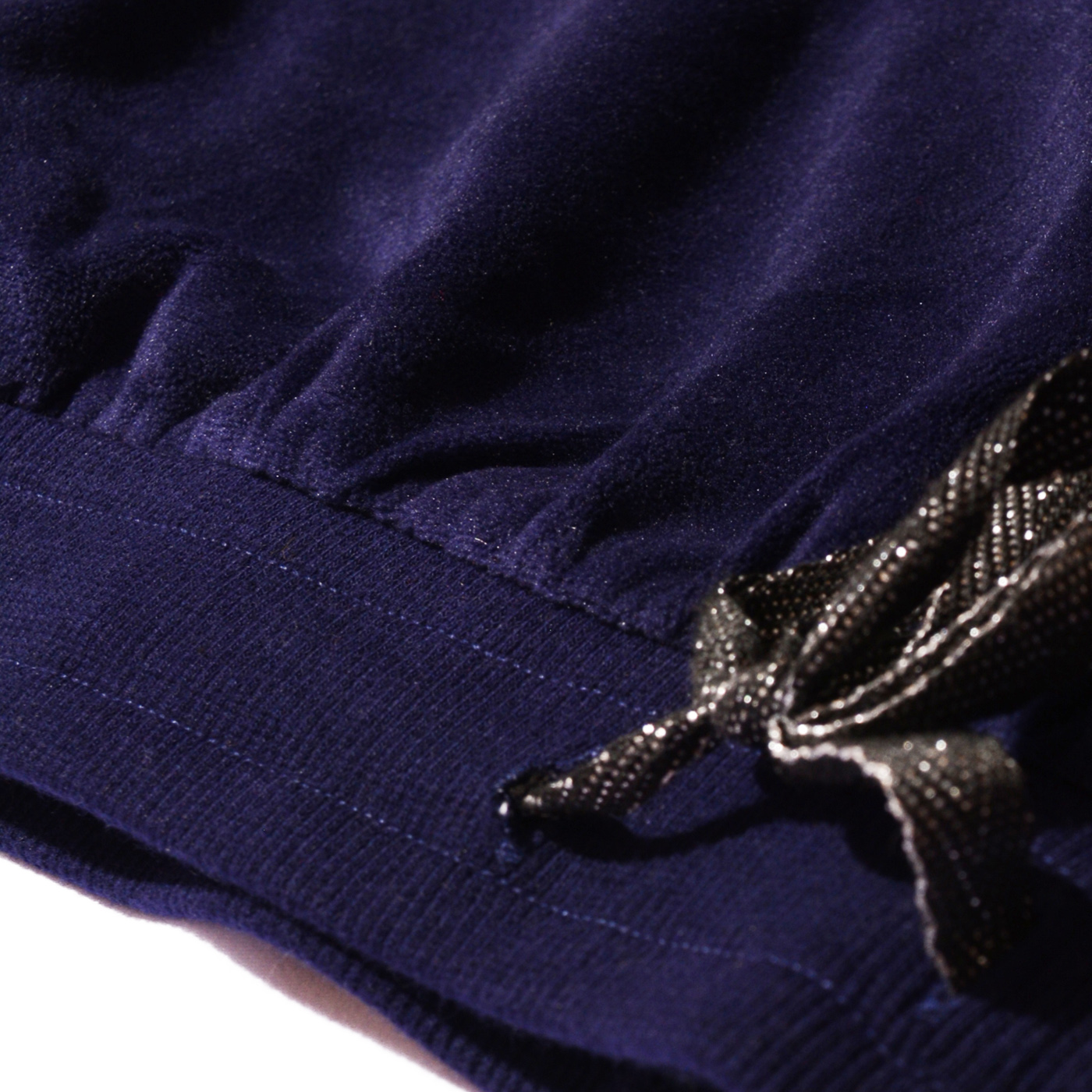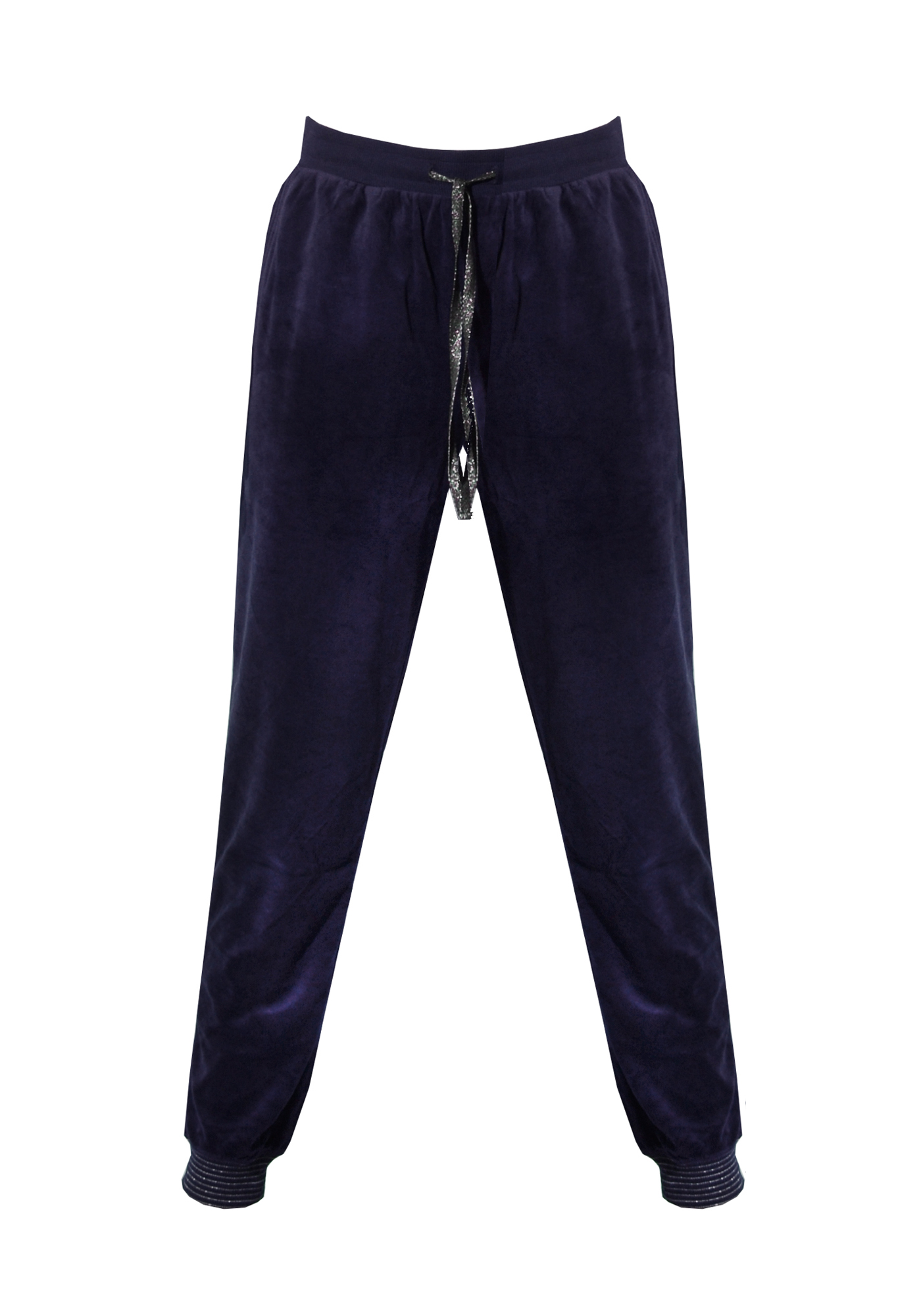 Silver yarn Velvet Pant in navy: These cool, relaxed jogger style trousers are crafted from an on-trend shiny velvet that looks great dressed up with heels or down with a sneakers.